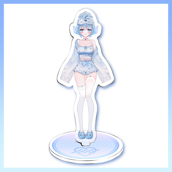 This stand is double sided, made of acrylic and measures at approx. 3" x 7.25". The base features a circle shape with a transparent gradient and the talent's logo.