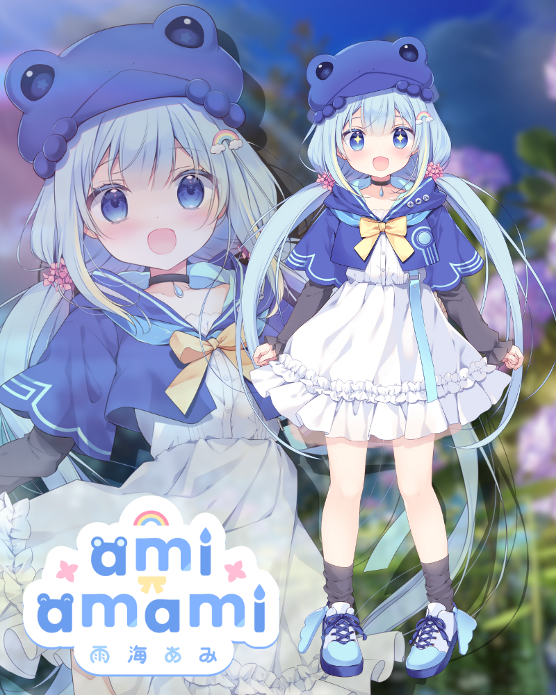 Konkero~! I'm Ami Amami, your rainy frog idol, and the hat on my head is actually my friend Eru! I hope to make you smile, rain or shine! My idol activities include singing and songwriting, voice acting, cute crafts, and gaming. Come along and let's take over the world- I mean, the stage- together! Originally, I debuted as a talent at Sony Music Entertainment, Japan's PRISM Project. Now, I am an independent VTuber doing my best to continue chasing my dreams! Let's make lots of hoppy memories together~