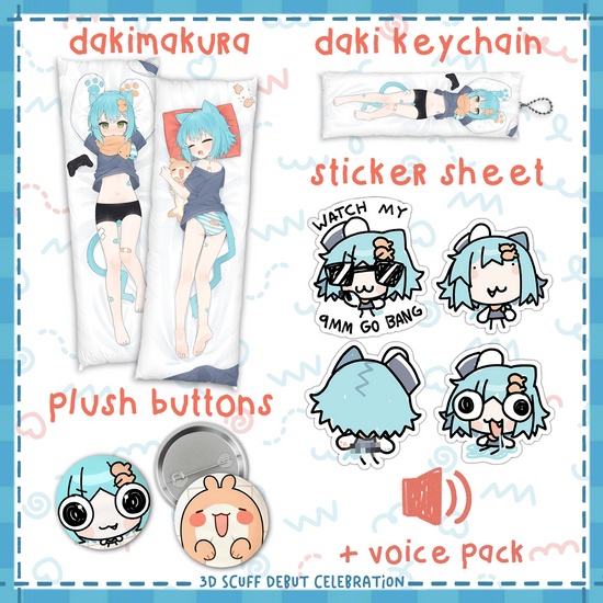 1 Krumroll Mini Daki Keychain, 1 Krumroll Sticker Sheet, 1 Krumroll Plush Button Set, 1 Krumroll Dakimakura Body Pillow Case & 1 Bundle Exclusive Voice Pack!