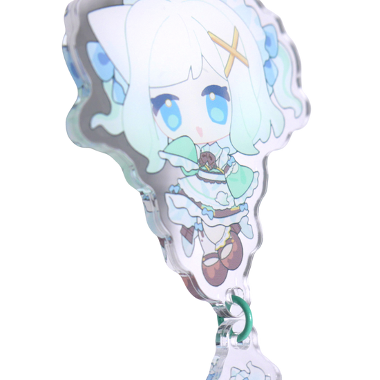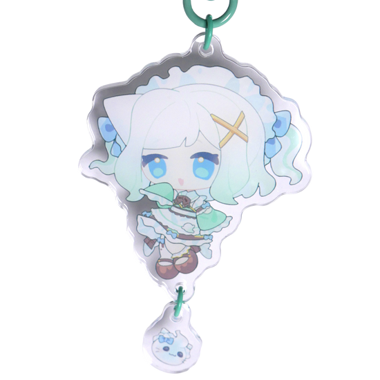 This keychain is made of acrylic and features a mint green heart shaped keychain clasp. Keychain is double sided and features two charms. The larger charm is 3" in height, with the additional charm hanging under it measuring at 0.75".